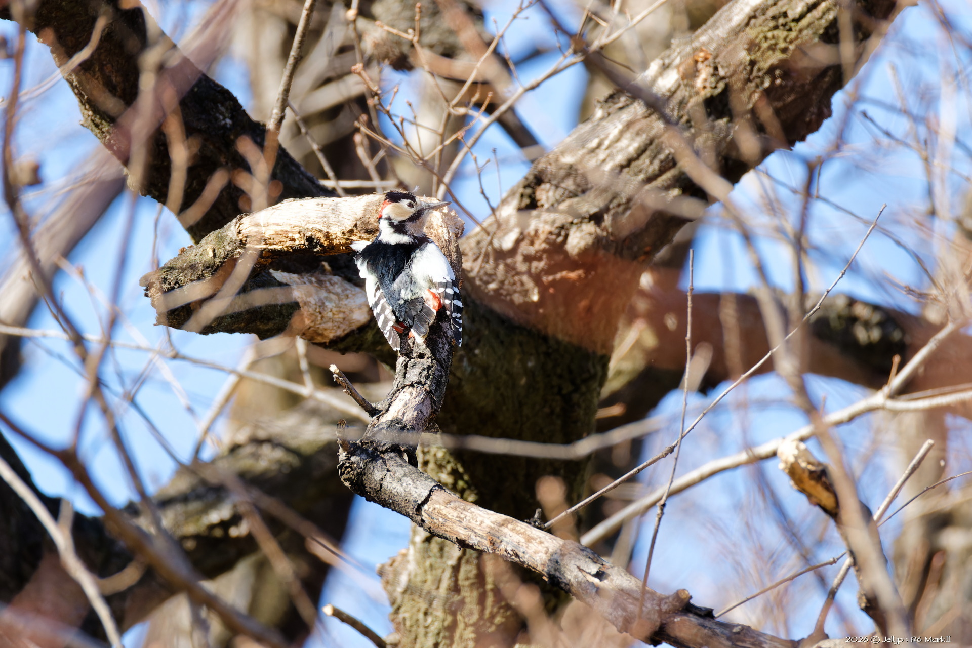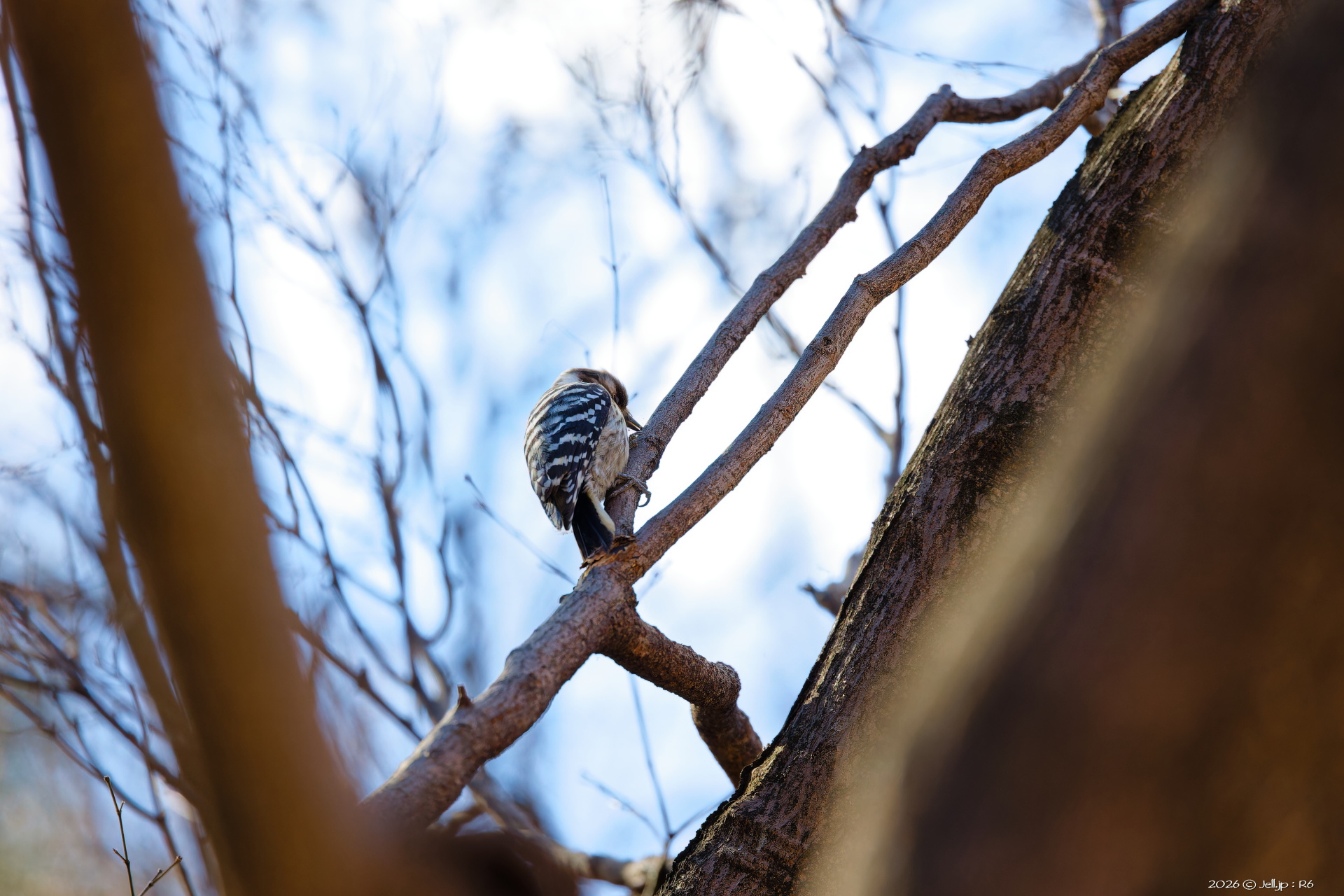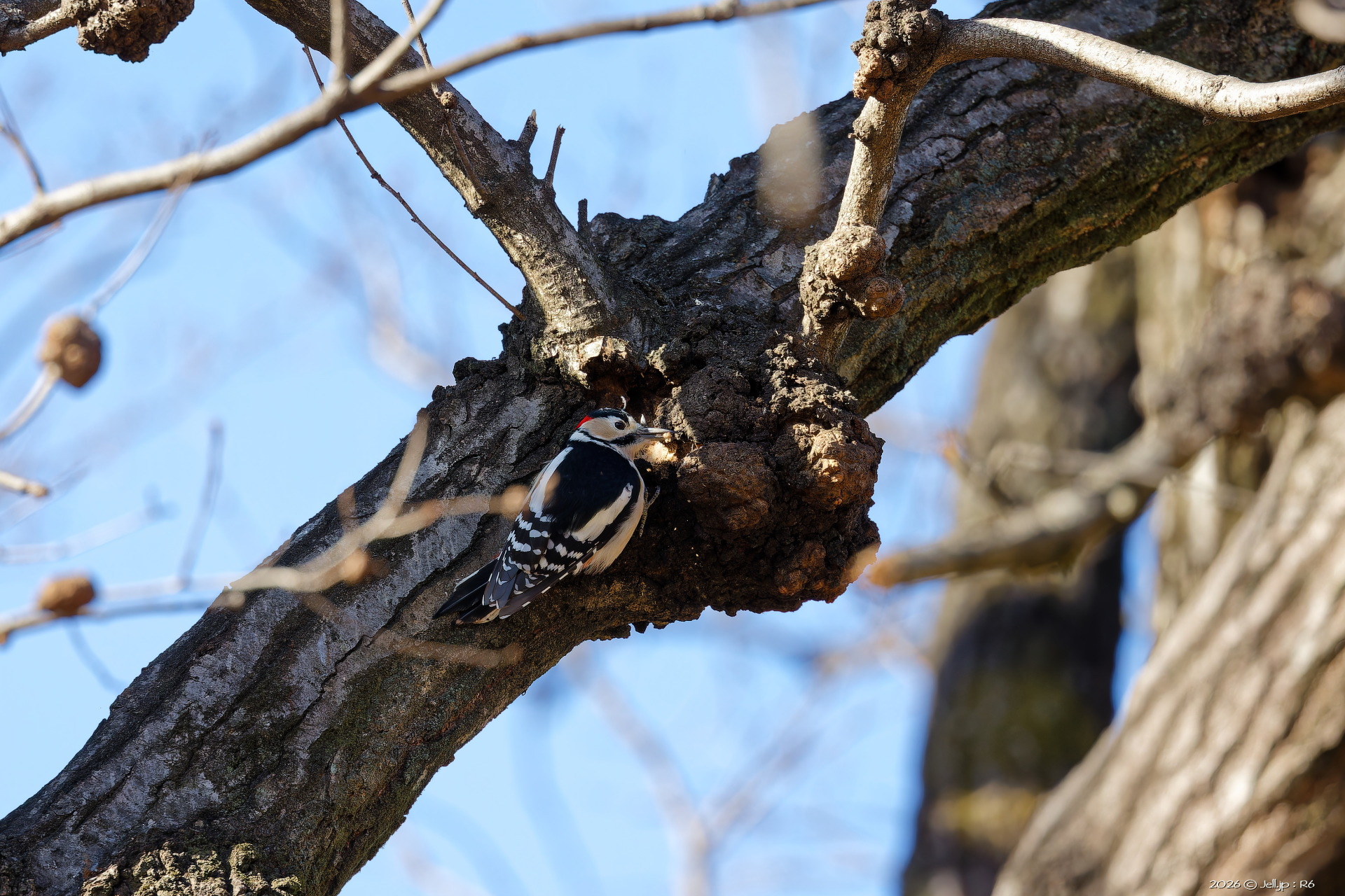 少し遠くに飛んだ後、木を突き何かを咥えた!